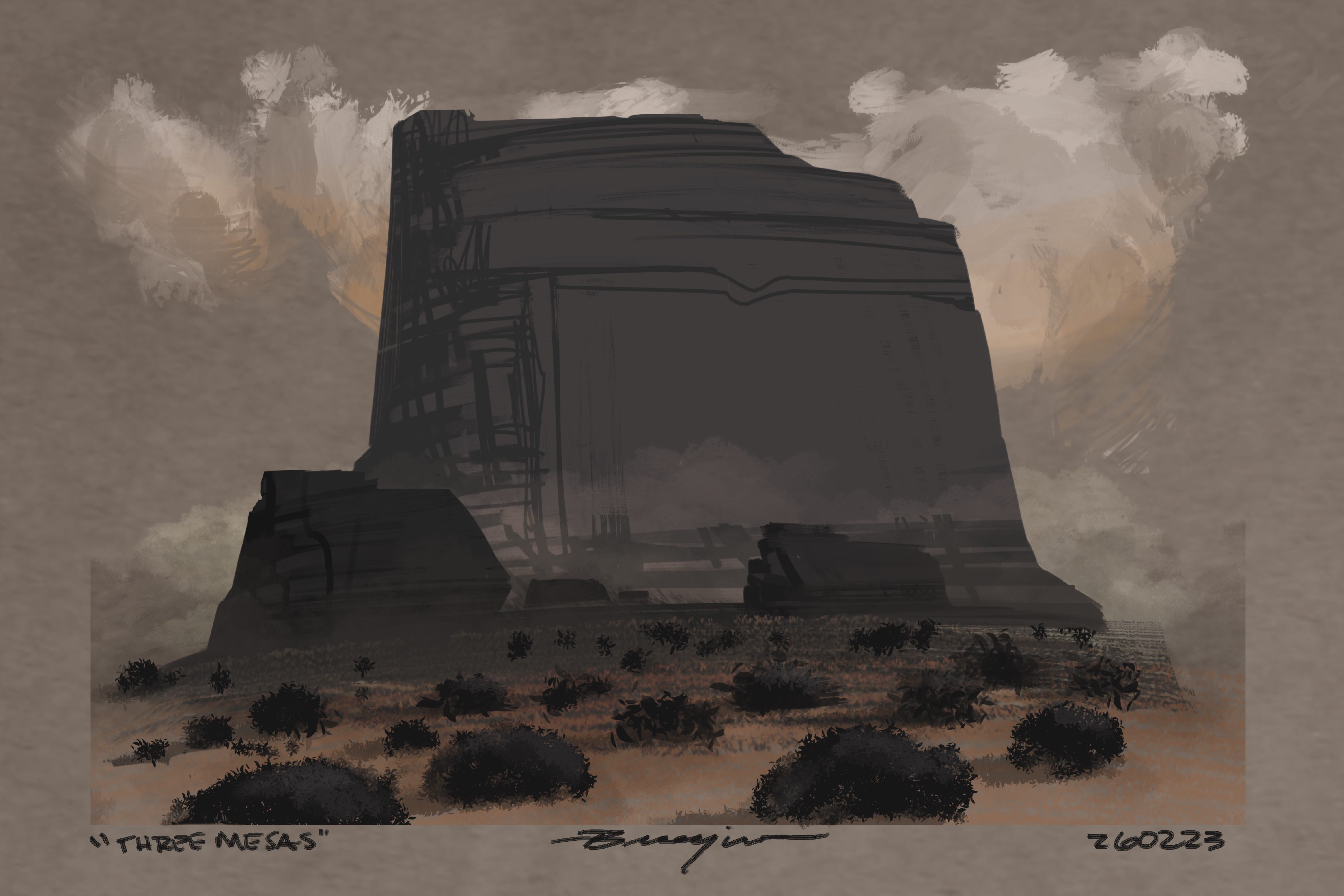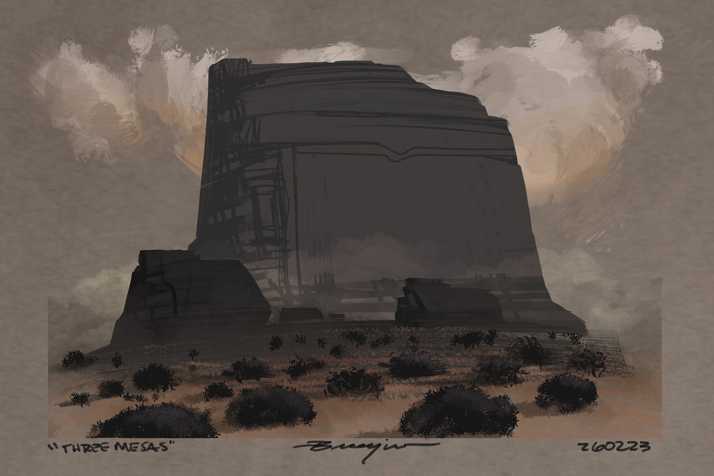 Big shapes. Controlled values. Atmosphere doing quiet work. I resisted the urge to over explain the environment. I let the form speak. I let the land breathe.